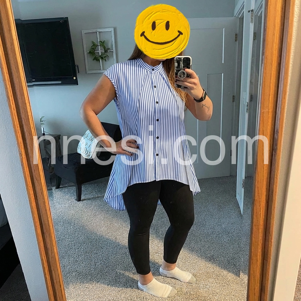 I love the dramatic high-low hem on this blouse. It covers my bum perfectly when I wear leggings, and the vertical stripes are very slimming. Highly recommend!