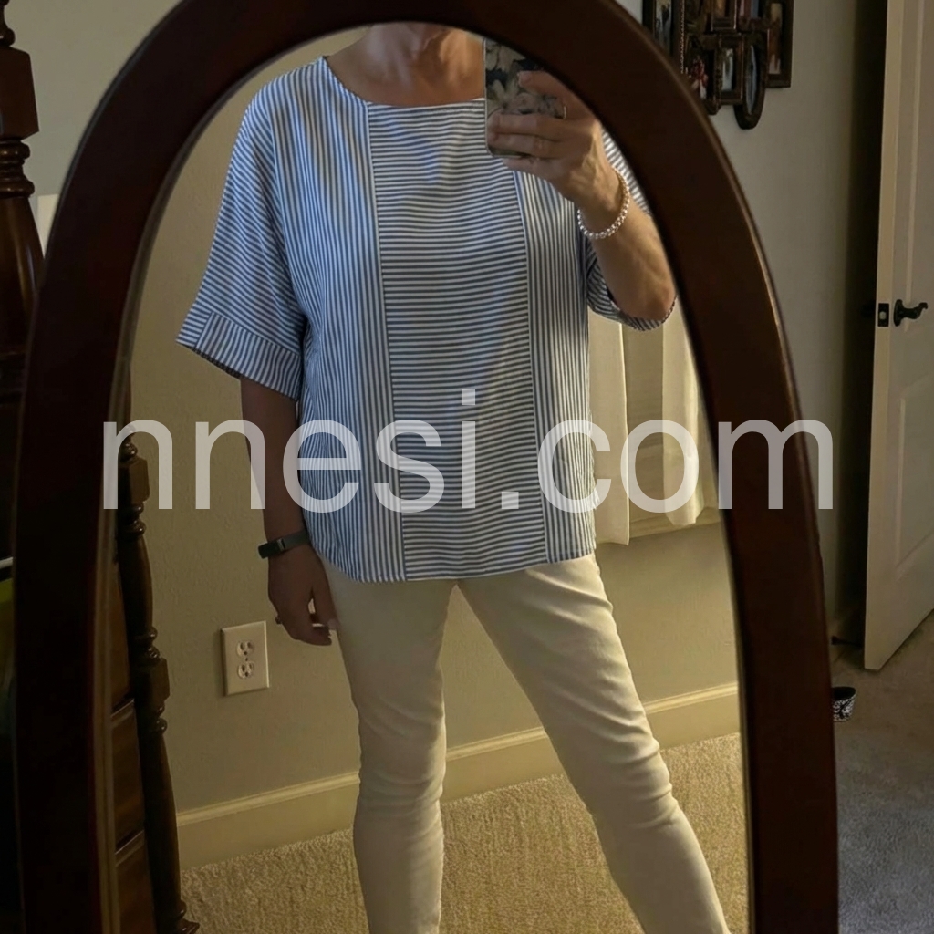 I absolutely love the mixed stripe design on this blouse! The horizontal stripes down the middle and vertical on the sides create such a flattering optical illusion. It is super lightweight and perfect for warm weather. Fits true to size with a nice, relaxed drape.
