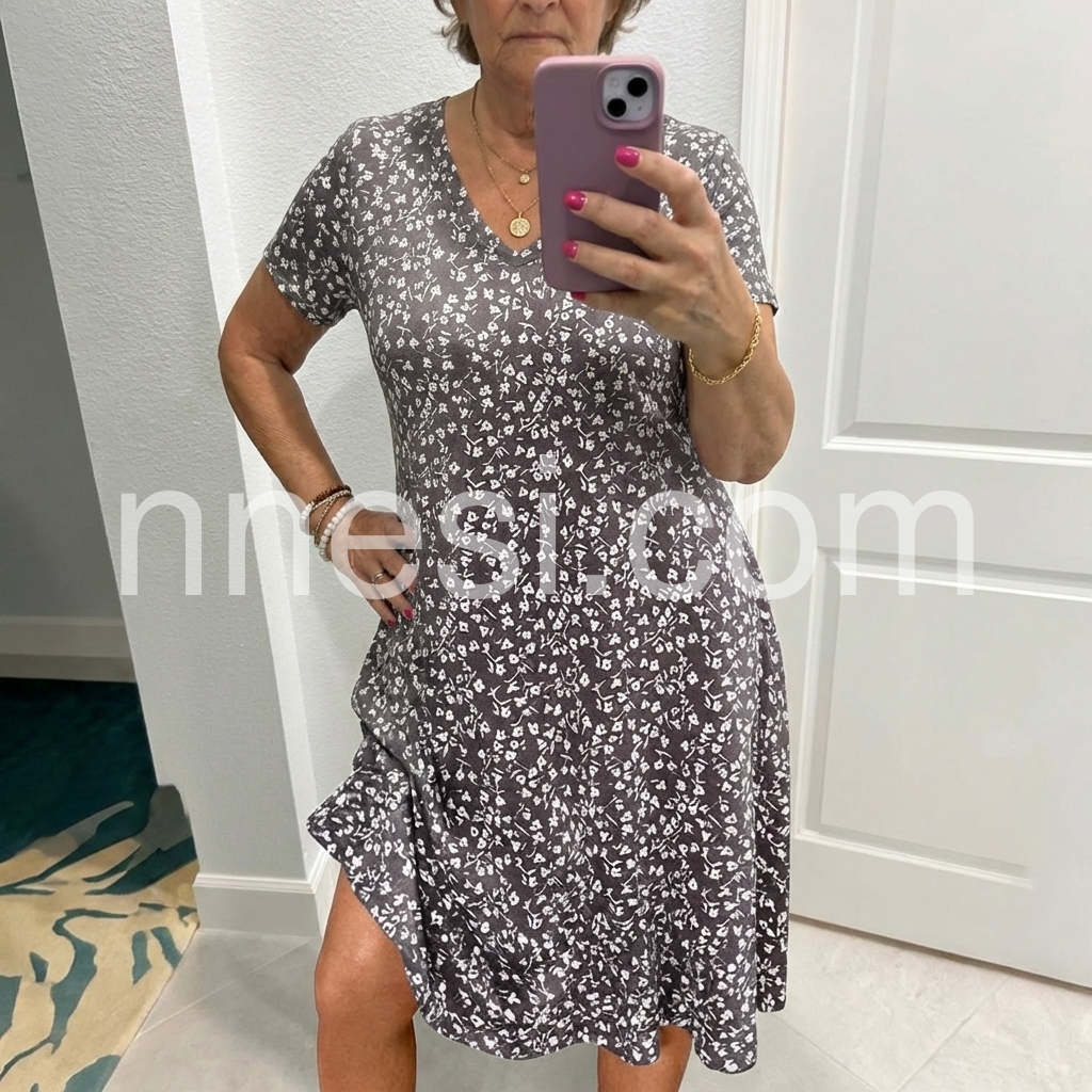 I absolutely love this dress! The fit is incredibly flattering and the v-neck is not too low. The material is soft and flowy, making it perfect for summer days. It hides my tummy well and hits right at the perfect midi length.