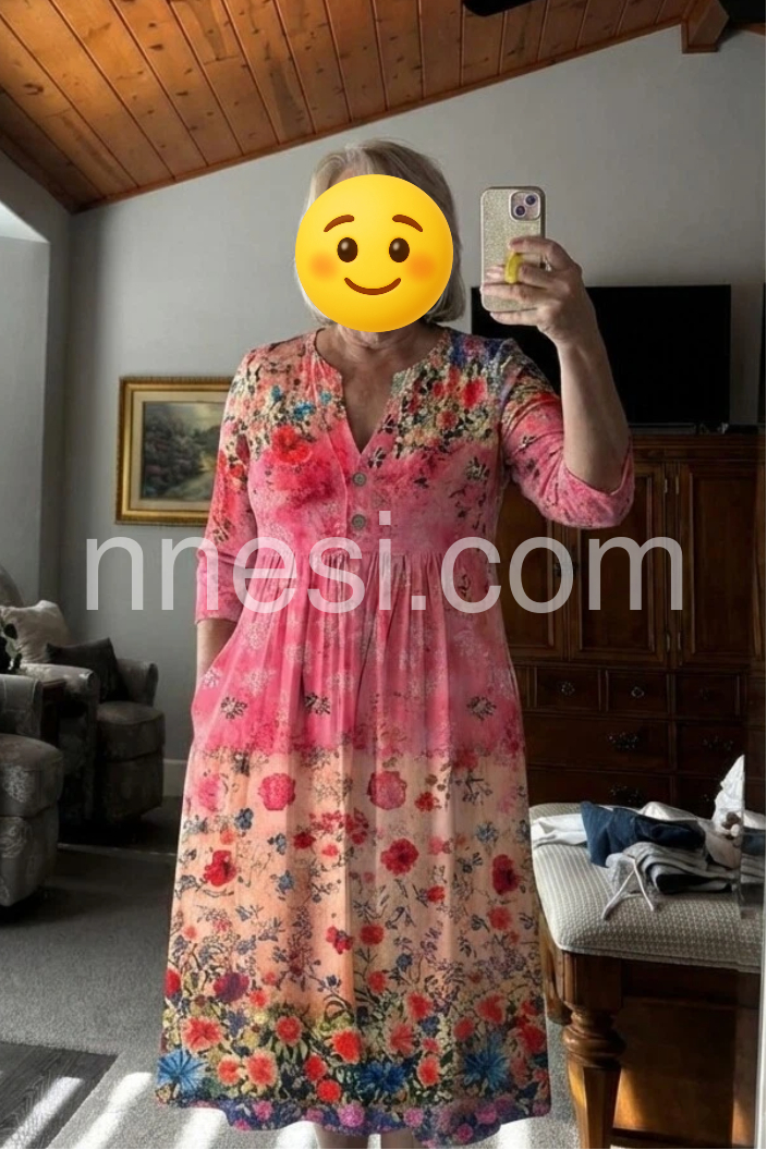 This is my new go-to dress for spring. The v-neck with the little buttons gives it a nice touch without being too low cut. The 3/4 sleeves are perfect for breezy weather. Definitely recommend!