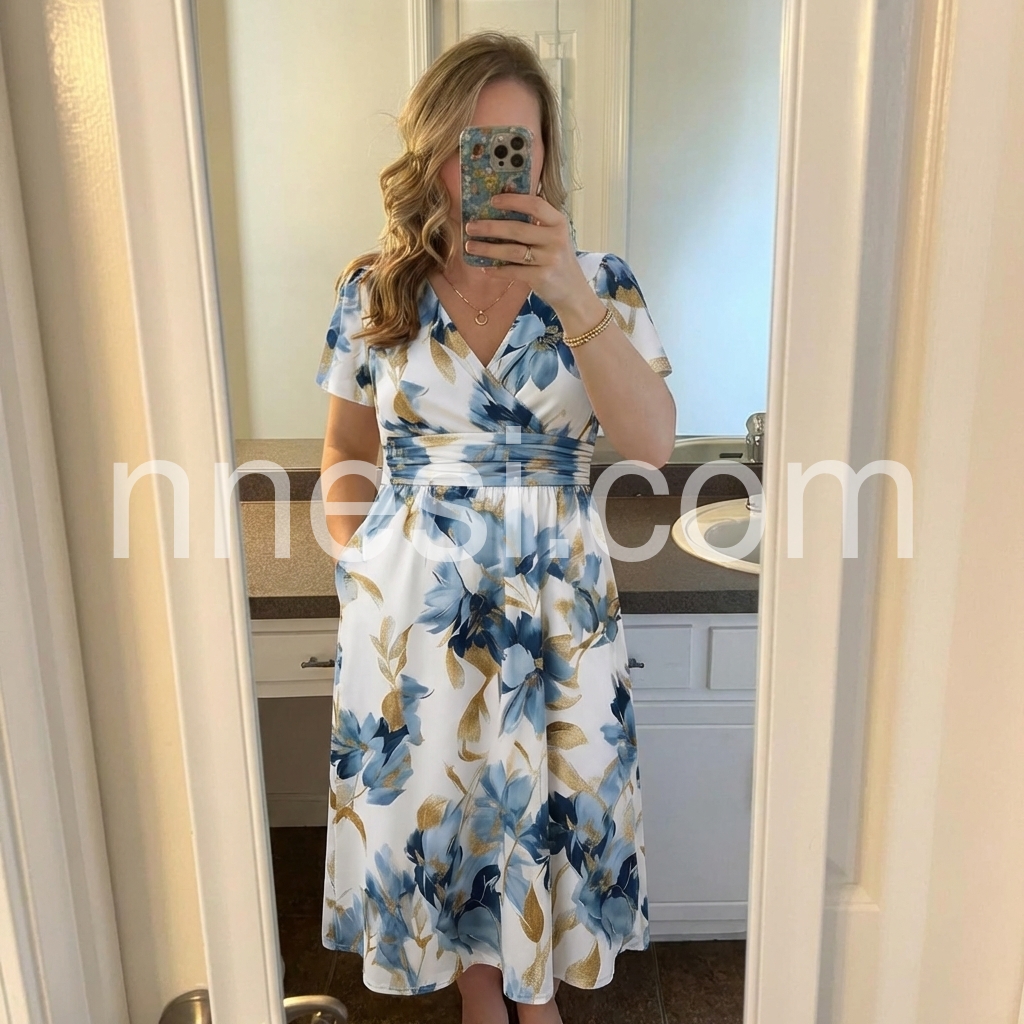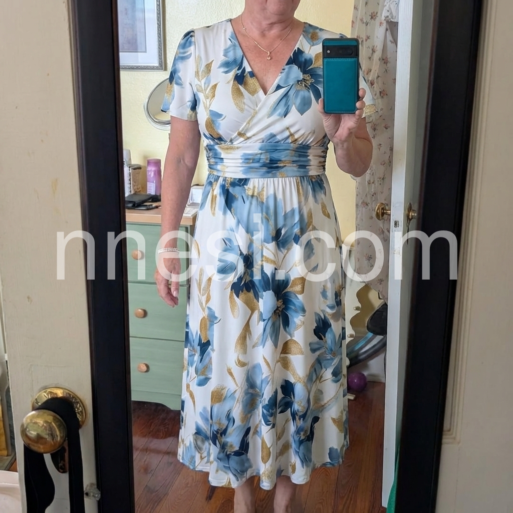 true to size (medium for me- 5β4β 150lbs) and comfortable. I am very pleased with this A line pleated flare dress. The cut is flattering and the overall construction feels well done. I ordered a size medium as I am normally an 8/10 and the medium worked well. One thing I especially appreciate is that it is modest while still looking polished. It feels like a complete outfit all on its own, which makes getting dressed simple. I am very happy with it and would recommend it.
