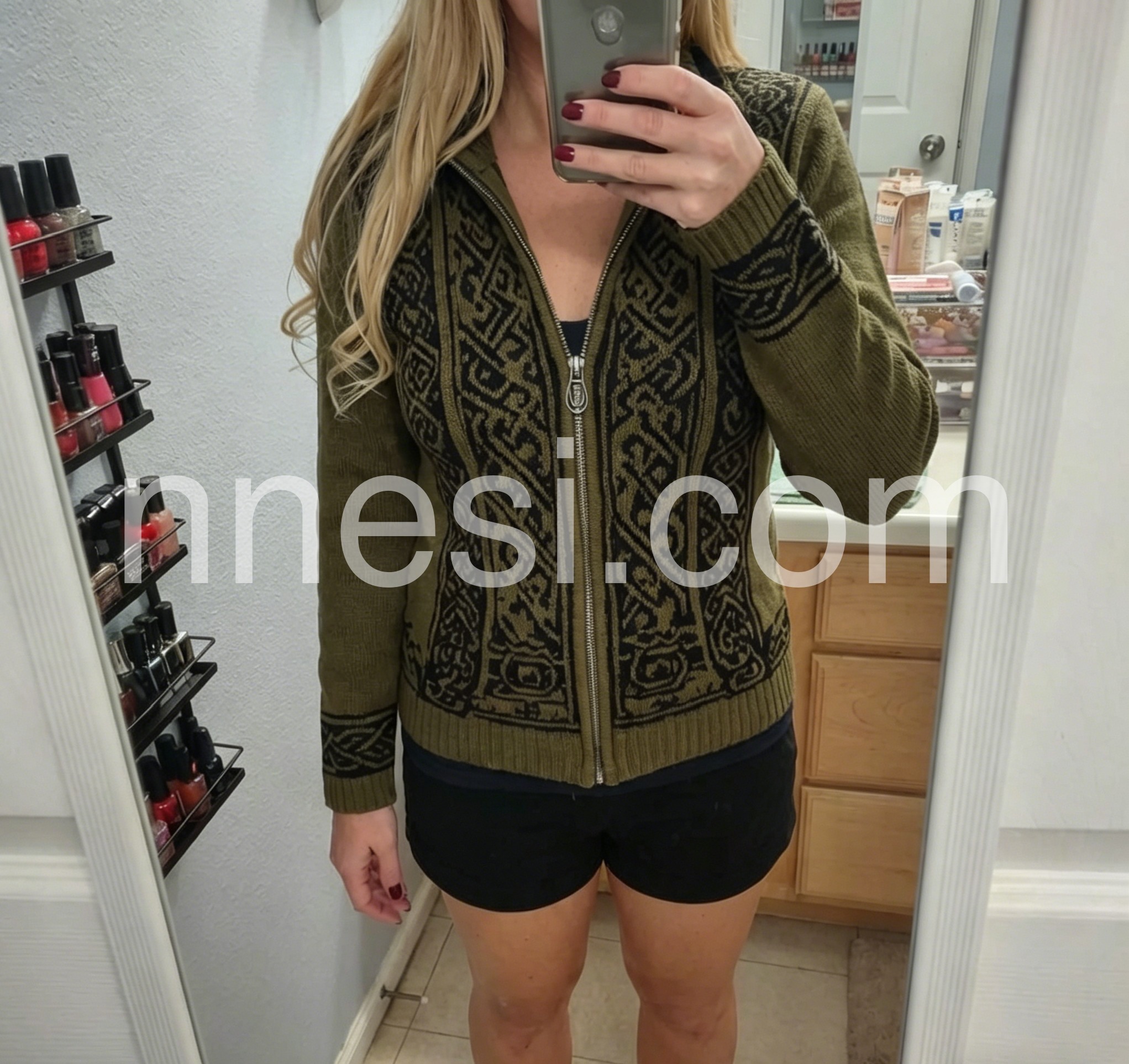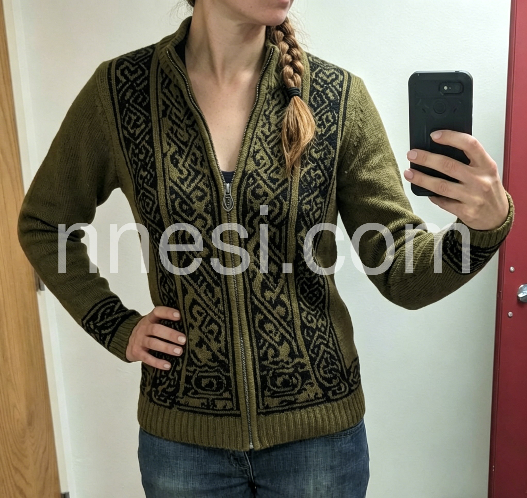 Iβm obsessed with this vintage-style knit jacket! The earthy olive hue and ornate Nordic-inspired pattern feel so timeless and unique, way more interesting than basic sweaters. The wool-blend fabric is incredibly soft and insulating, perfect for layering over tees or turtlenecks. The fitted silhouette flatters my figure without being tight, and the silver zipper adds a sleek, polished touch. Itβs become my go-to for weekend hikes, coffee runs, and even casual date nightsβversatile, stylish, and so cozy!
