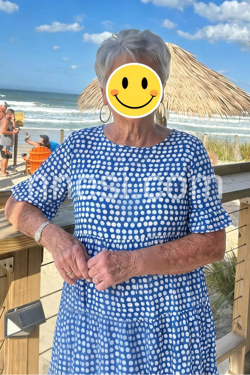 I love how effortless this dress looks while still feeling stylish. The fabric is light and breathable, and the relaxed cut is flattering in all the right waysβit skims my body instead of clinging. The blue-and-white dotted print is so classic. With a straw bag and simple sandals, itβs the perfect outfit for a getaway or a sunny day out.