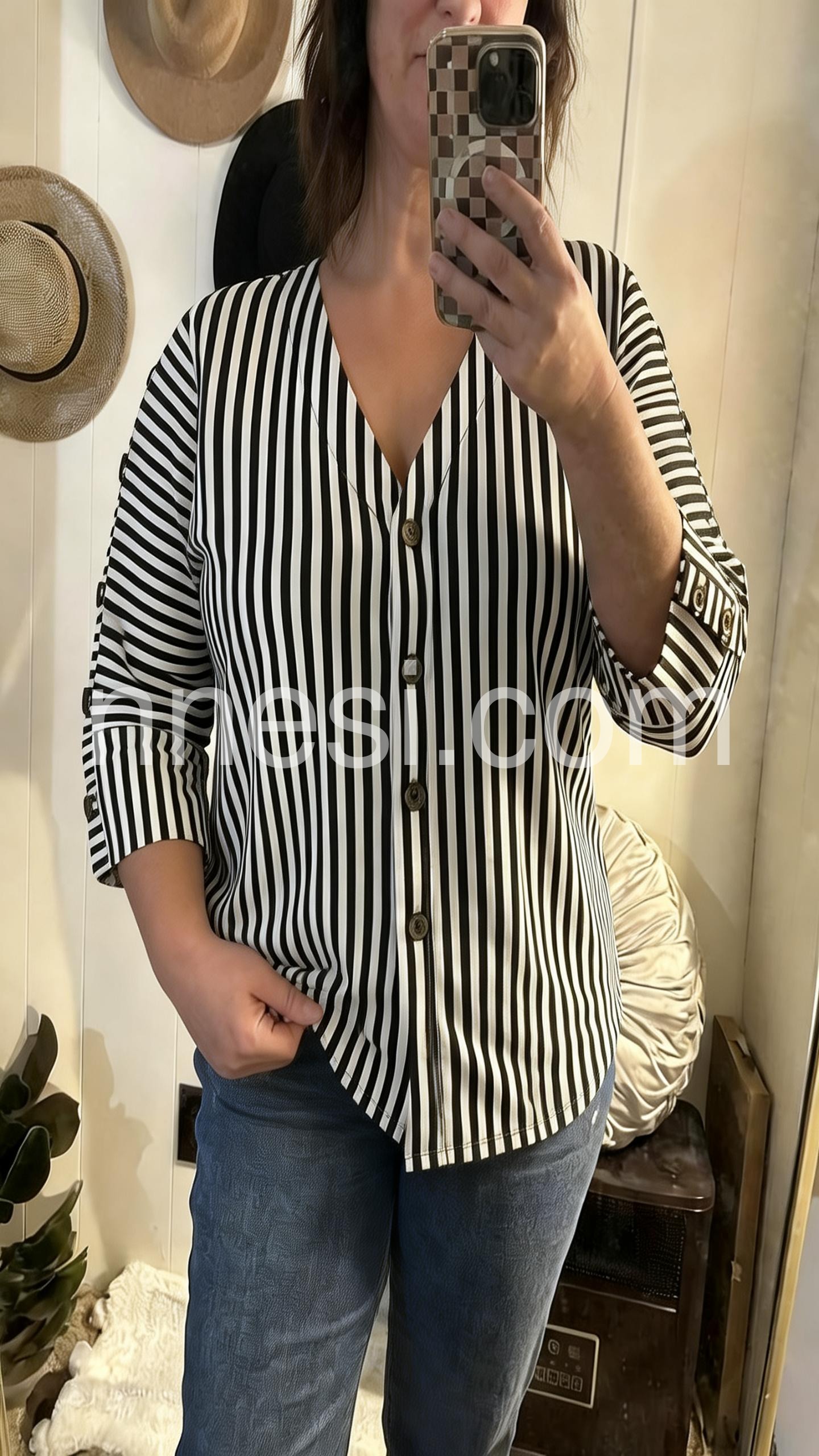 I absolutely love this striped blouse! The vertical stripes are so slimming, and the contrast with the horizontal stripes on the sleeves adds such a unique touch. It fits perfectly and looks great for work or a casual day out.