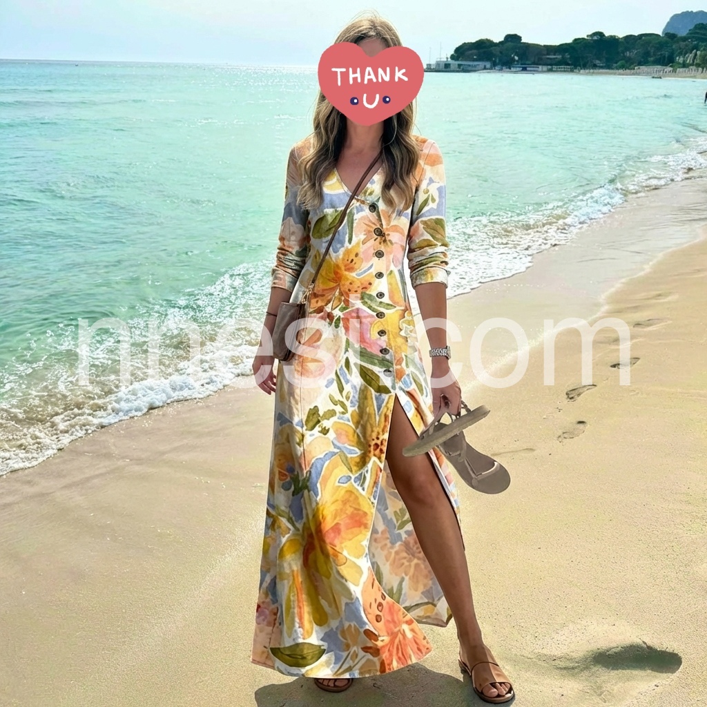 I am absolutely in love with the watercolor floral print of this dress! The colors are just as vibrant as the picture. The V-neck and button-down style make it very flattering, and the material is soft and flowy. Perfect for a spring wedding or a brunch date.