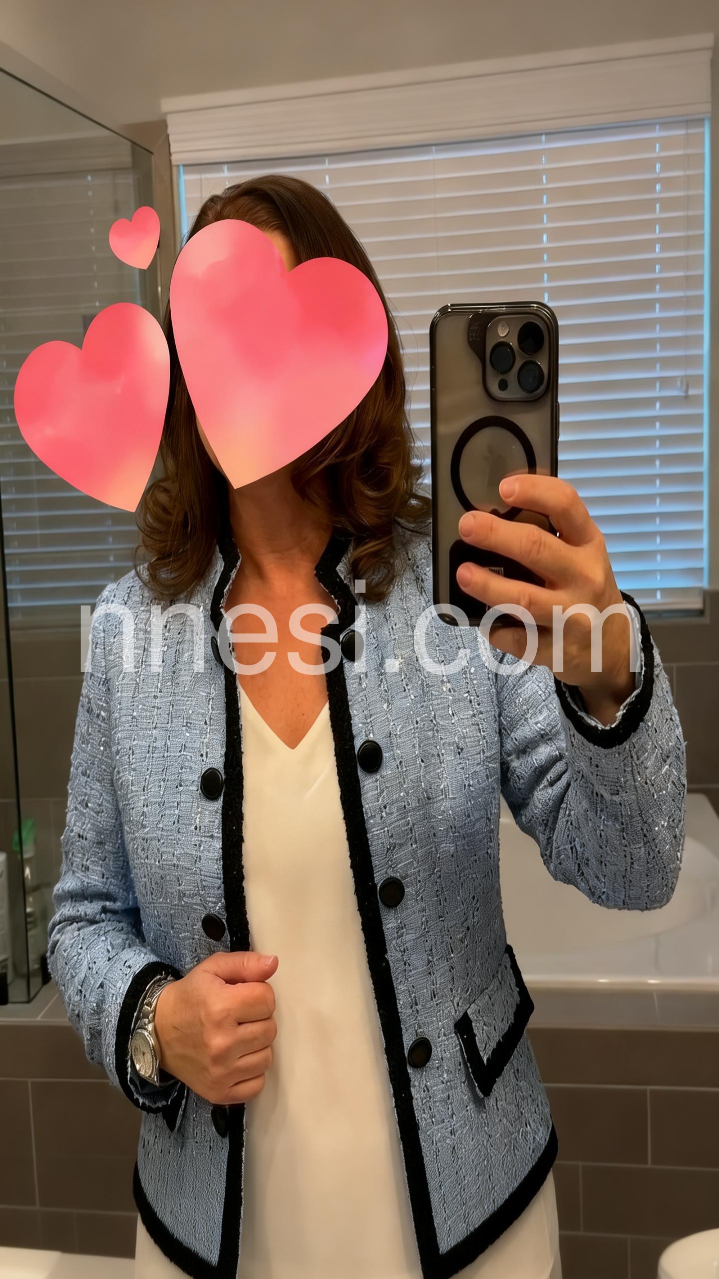 I absolutely love this jacket! The blue textured fabric looks high quality, and the black trim gives it such a classy, standout look. The button details are cute and the fit feels flattering and comfortable. It pairs perfectly with a simple top underneath, and it looks exactly like the photos. Overall, great quality and a really stylish find.