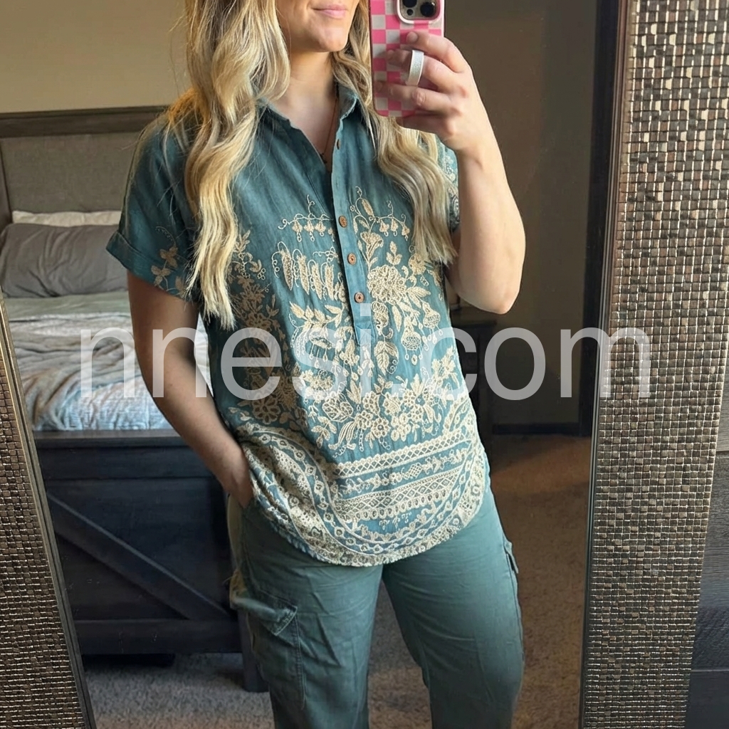 I absolutely love the teal color and the intricate floral pattern on this top. It fits true to size and is incredibly comfortable for casual outings. The material feels light and airy.