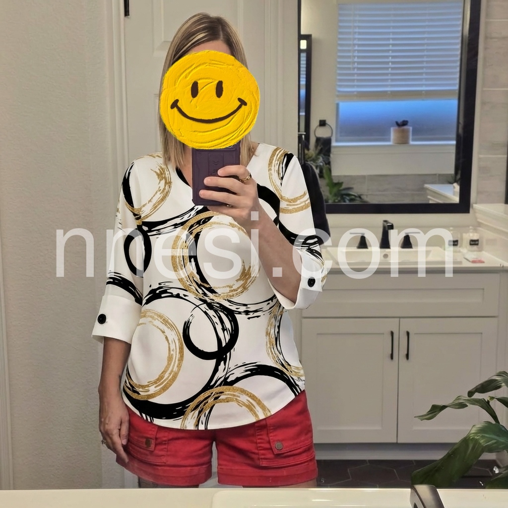 Gorgeous print! The brushstroke design is very modern and chic. The cuffs on the sleeves are a stylish detail that makes the top look much more expensive than it is. Highly recommend!