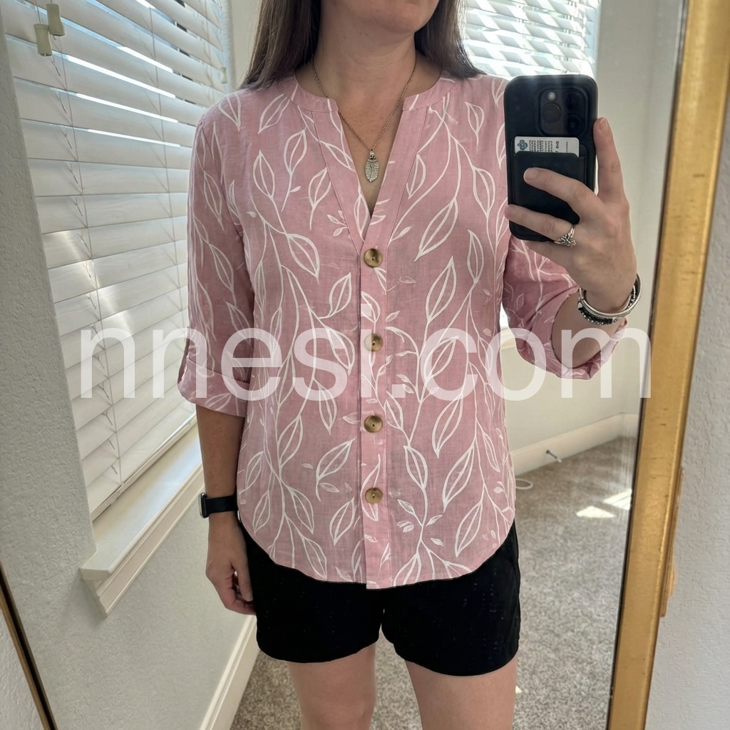 I absolutely love this top! The dusty pink color is so flattering, and the white leaf pattern gives it a fun, tropical vibe. It fits true to size and is incredibly comfortable for hot summer days. I wore it with white denim shorts just like the model, and got so many compliments.