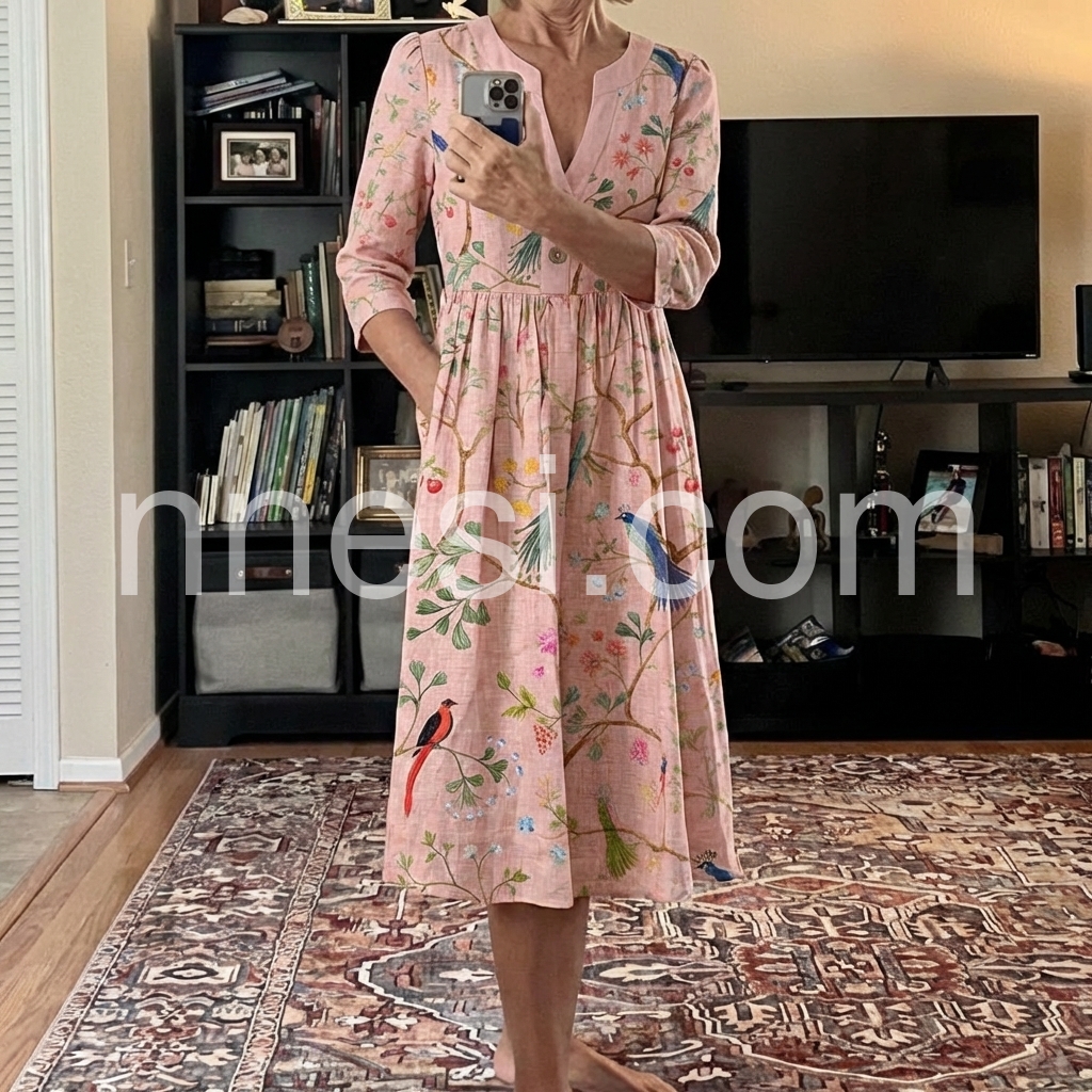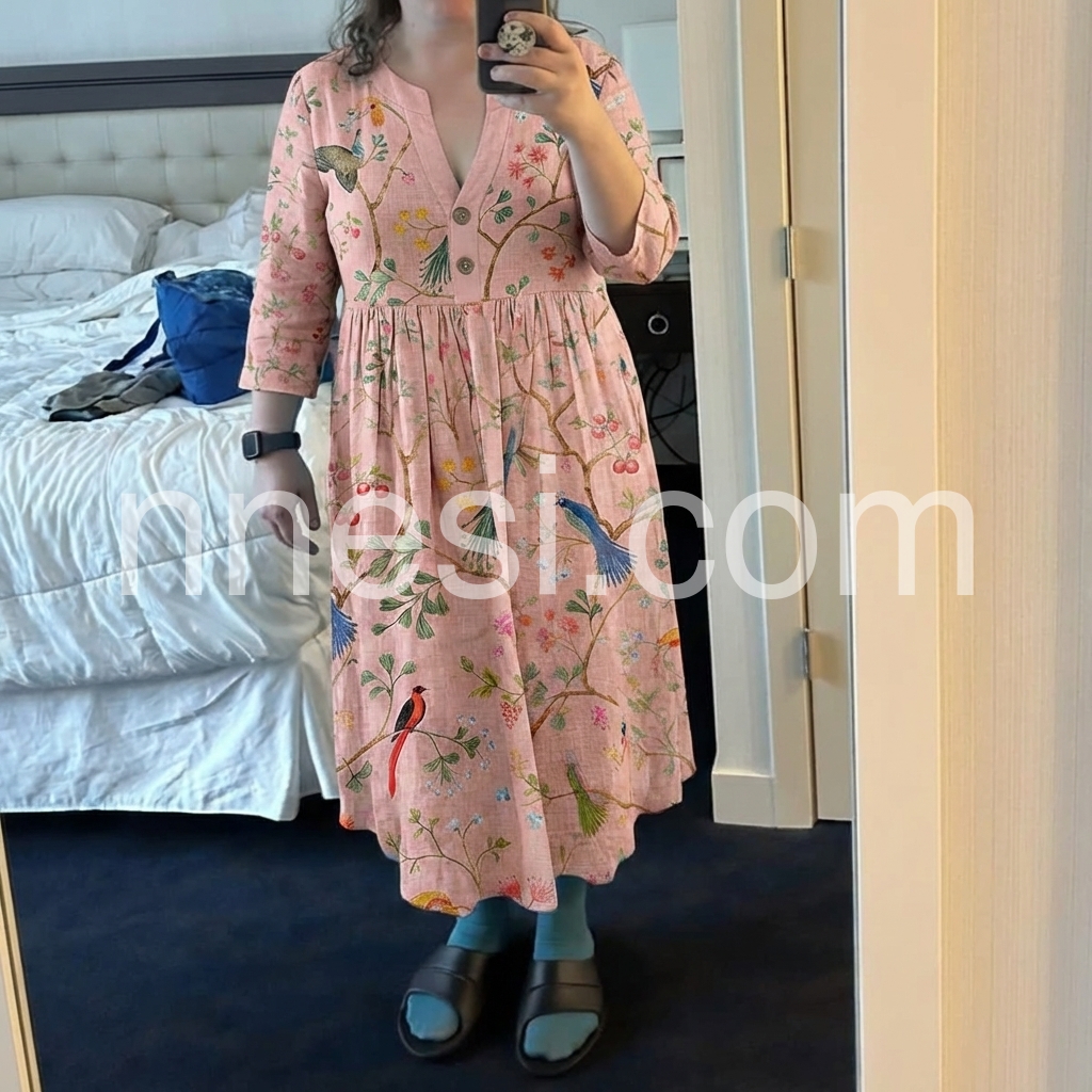 Perfect dress for running errands or grabbing lunch with friends. It is casual but the pretty bird pattern makes it special. True to size.