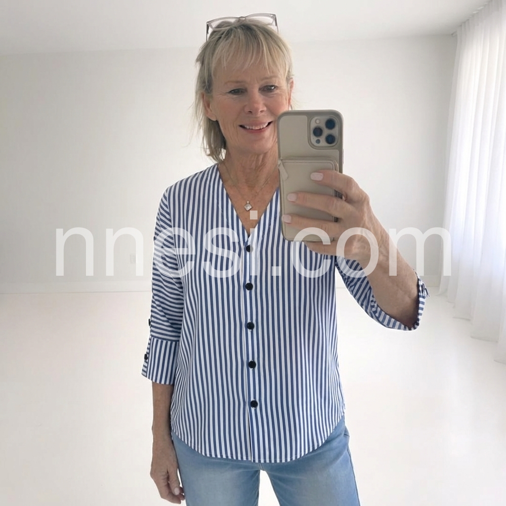 Absolutely love this top! The vertical blue and white stripes are so slimming and the V-neck is just the right depth. It looks great paired with my favorite jeans for a casual day out. The material feels lightweight and breathable too.