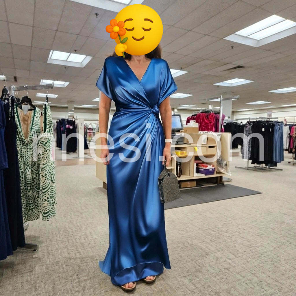 This blue satin maxi is stunning and perfect for online once you try it on at home. The wrap design with a waist knot creates a flattering silhouette, and the satin drapes beautifully. The color is rich and elegant, ideal for formal events or a classy evening out. Pairing with a small purse and simple sandals gives a polished, effortless vibe. True to size with good movement in the fabric. Smooth checkout and responsive customer support--highly recommended for a glam look you can wear online shopping with confidence.