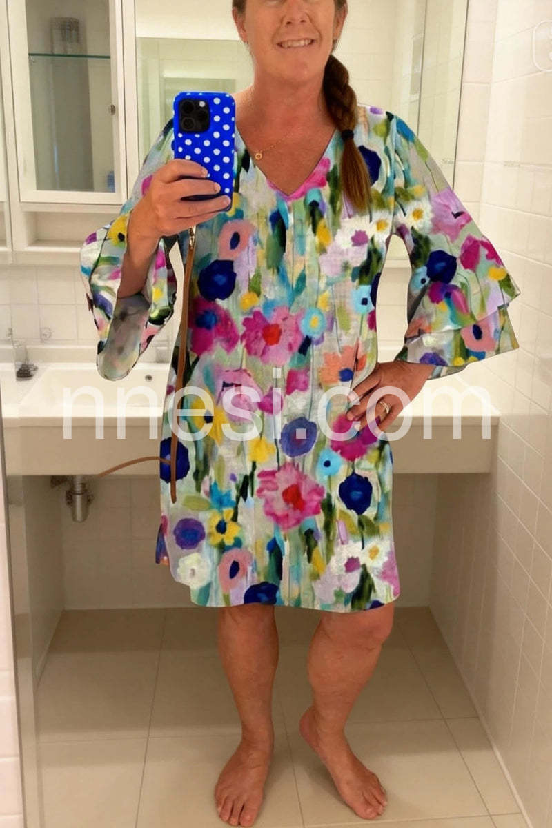 Love the bell sleeves on this dress. It is flowy without looking like a tent. Very comfortable and the fabric feels high quality.