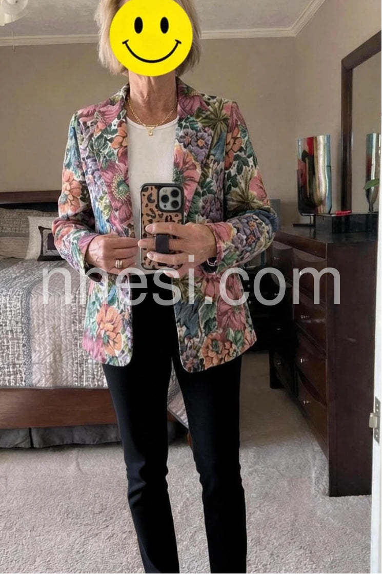 Absolutely love this blazer! The floral pattern is so vibrant and looks exactly like the picture. It has a beautiful tapestry-like texture that makes it look way more expensive than it is. I paired it with white jeans just like the model and got so many compliments at brunch.