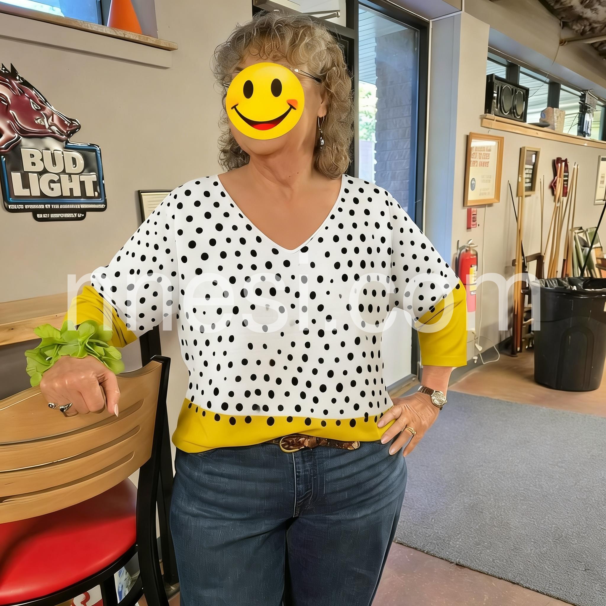 Perfect casual top. It is loose enough to be comfortable all day but still gives a nice shape. The color combination is striking. Five stars from me!