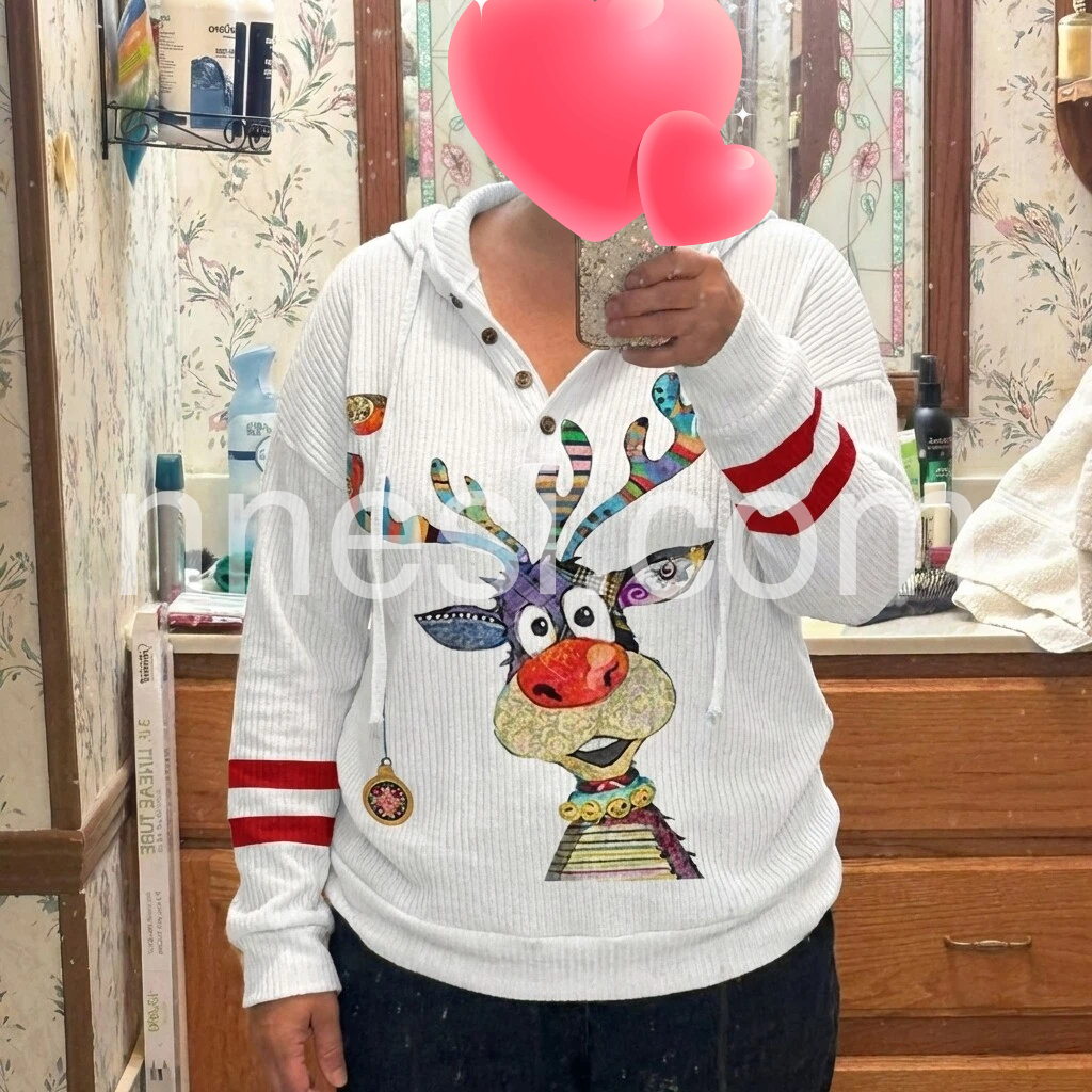 Bring in the winter season with this holiday-ready reindeer top. A white cozy ribbed top with red stripes and colorful reindeer print make this hoodie a cheerful complement to your day or night with its relaxed vibe. Β A plunging v-neck and buttons on the front give it the perfect amount of detail and chic fit.