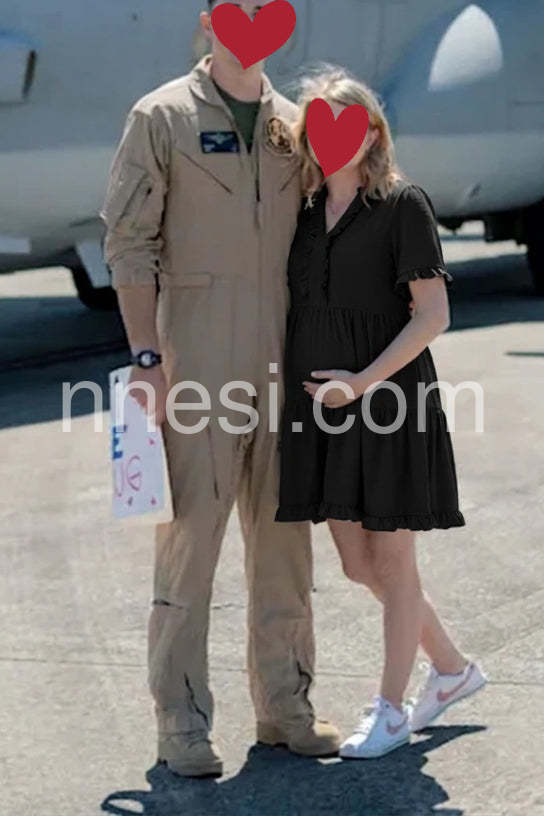 This black dress is so comfortable and flowy. I love the ruffle details around the v-neck. It fits perfectly and hides my tummy.
